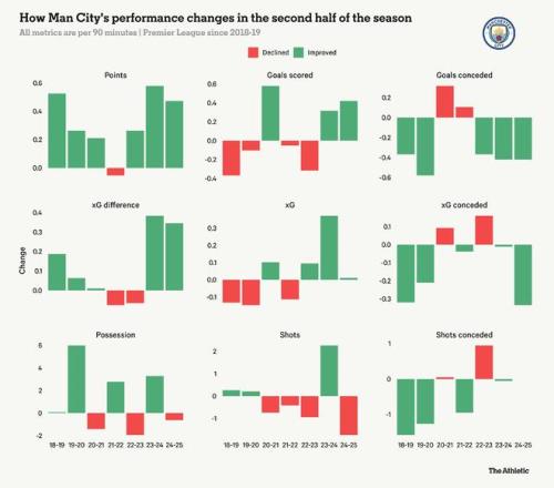 下图中的数字显示,他们的积分往往在赛季中期后飙升,并且其基础是防守端逐渐稳固。瓜迪奥拉会利用上半赛季的经验教训来填补漏洞,为另一座冠军铺平道路。